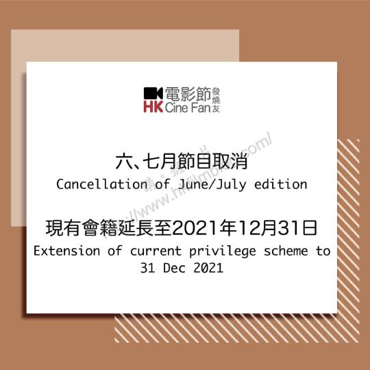 較早前,香港國際電影節協會已取消了電影節發燒友的四月與五月電影節目,現在則會繼續取消六月及七月的節目。至於會籍安排方面,現有會籍原於今年十二月三十一日到期,現延長一年至明年十二月三十一日,也顯示電影節協會答謝觀眾對他們的支持。