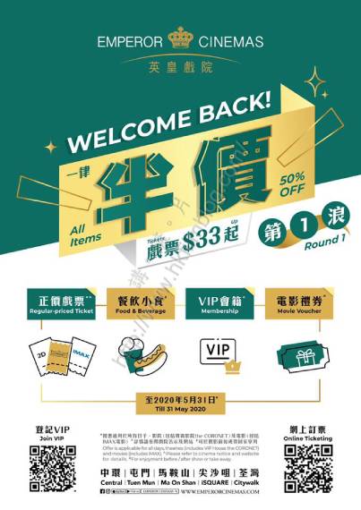 先來看看英皇戲院的優惠,於五月提供票價優惠,而且更為徹底,所有票價一律半價,網上訂票繼續免手續費,就連餐廳小食都係半價。至於電影禮券,亦以六十元半價發售,可以適用於中環娛樂行及尖沙咀iSquare等全線戲院,有效期至明年一月底,而會籍則供半價入會。如斯的減幅,同樣也來得相當徹底。