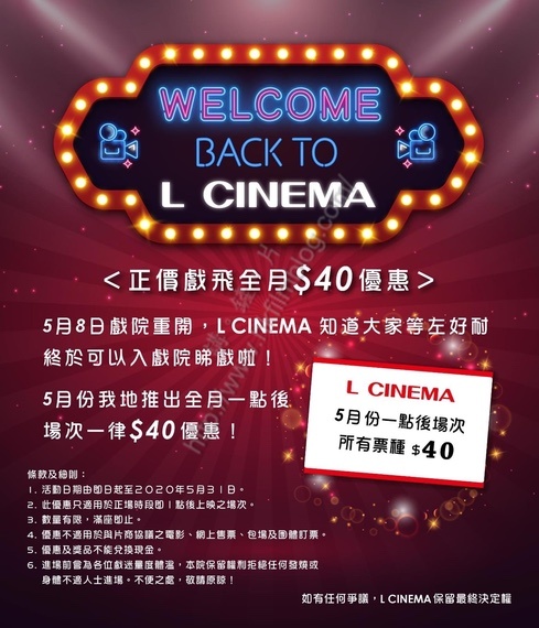 上圖所見,便是L Cinema為戲院重開的優惠,優惠就是像其他獨立營運戲院一樣提供票價優惠,當中下午一時後的全部場次,票價一律為四十元,而優惠由昨天起直接五月底。惟觀眾要留意的是,目前L Cinema只有一院營業,二院近日並沒有場次放映。