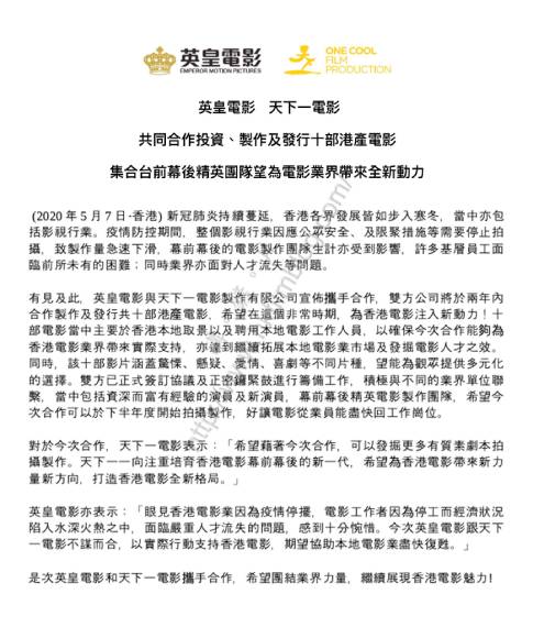 隨著武漢肺炎在香港的疫情看來有緩紓的現象,戲院亦已經重開,不過隨時而來就是需要面對片源與市場的問題。而香港的電影公司自今年以來近乎停擺,不過隨著疫情緩和,似乎大家都希望製作電影。當中英皇電影與天下一電影便於上周發出新聞通告,宣佈共同投資、製作與發行十部電影。