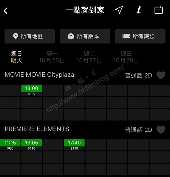 上圖所見,便是我們發行、香港導演許宏宇執導的《一點就到家》。電影首天安排於百老匯院旗下的五家戲院上映,惟首天已經出現「有緣人」場次,其中四間只提供早上十一時許早場,只有Premiere Elements提供三場。而到了今天,除了Premiere Elements提供三場外,就只剩下太古城MOViE MOViE Cityplaza繼續上映。