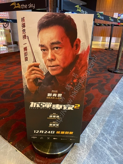 上圖所見,便是「講。鏟。片」情報人員在奧海城二期The Sky所攝,可以看到在戲院票房的排隊欄杆,已經可以看到電影《拆彈專家2》宣傳品,共有三面設計,其中一面看到男主角劉德華,左上角寫上「核彈危機,一觸即發」,下方寫上「12月24日核爆倒數」。
