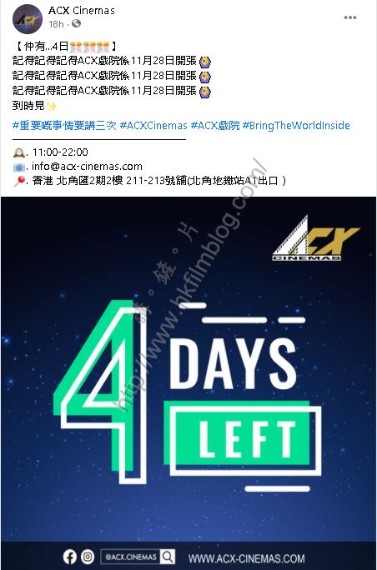 ACX戲院在其官方Facebook專頁昨天貼出的告示,指出ACX戲院將於十一月二十八日,亦即是本周末開業。不過,該戲院的其他詳情,例如票價、戲院特色與座位數目等仍有待官方的公佈。