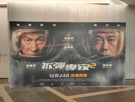 上圖所見,便是「講。鏟。片」情報人員於昨天晚上在銅鑼灣UA Cine Times戲院大當所攝,可以看到該戲院大堂的一角,擺放了電影《拆彈專家2》的大型宣傳板,當中上方寫上「核彈危機,一觸即發」,左、右兩方分別是兩位主角劉德華與劉青雲穿上爆彈品處理課的服飾,當中劉德華在剪一條紅色的電線,而劉青雲剪的則是藍色電線,下方則寫上「12月24日核爆倒數」。