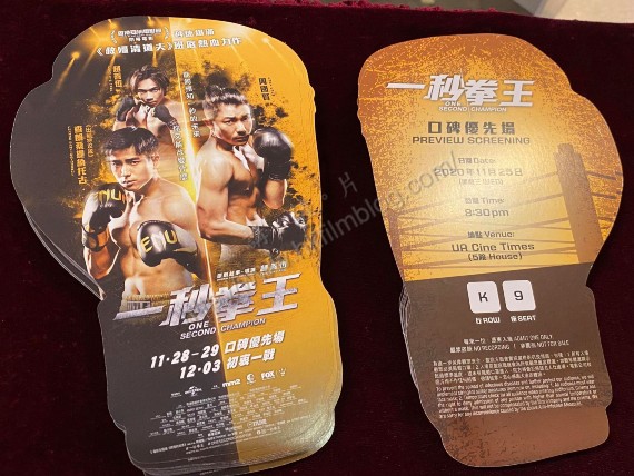 環球電影香港發行、趙善恆原創故事兼執導,周國賢、查朗桑提納托古、林明禎及趙善恆主演的《一秒拳王》將於十二月三日在港上映,並且於近日舉行了多場優先場放映,當中戲票的其中一面,便是仿如拳套的設計,左手與右手的套拳合成一對來顯示片名。