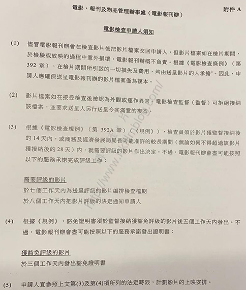 香港目前的電檢查,是由電影、報刊及物品管理辧事處(下稱「電影報刊辦」)負責。然而近期呈交影片到電影報刊辦的話,卻收到一份附件,列明電影檢查申請人須知。