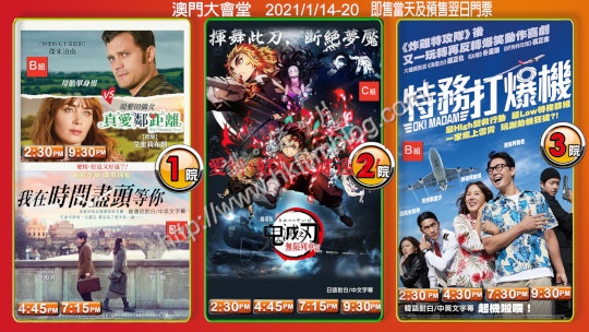 上圖所見,便是位於澳門半島的澳門大會堂戲院本周上映時間表,當中看到一院的《我在時間盡頭等你》、二院的《鬼滅之刃劇場版:無限列車篇》與三院的《特務打爆機》均曾於香港上映。不過較為特別的,卻是在一院安排了一部名為《真愛鄰距離》的電影。