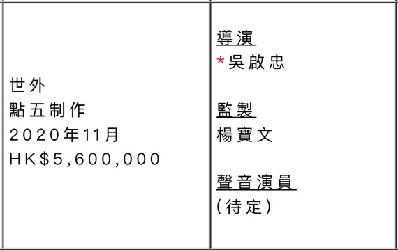 《世外》由點五制作,該片於去年十一月獲電影發展基金融資達560萬,至於該片由誰作聲音演員待定。不過觀乎過去吳啟忠短篇動畫作品的成績相當不俗兼有獲獎,實在對香港觀眾有一定的期待。