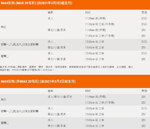 IMAX影廳方面,成人IMAX 2D價為130元,小童、學生與長者一律為80元,當中周二無論成人與學生等一律為80元。值得注意的是,該戲院特別設有IMAX影廳放映非IMAX電影票價,成人2D票價為110元,較一般影廳貴20元。而MCL其他會員優惠也在這家戲院不適用。