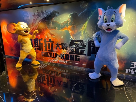 由演藝人員扮演的Tom & Jerry於星期六下午二時許出現在Cinema City朗豪坊八樓大堂,兩位主角先在該戲院大堂《哥斯拉大戰金剛》前分別扮上哥斯拉與金剛。