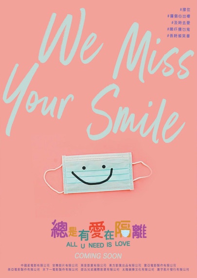 上圖所見,便是電影《總是有愛在隔離》的初版海報,海報以粉紅色為底色,然後出現一個口罩,並且用上仿如箱頭筆劃上笑臉,然後寫上「We Miss Your Simle」字眼,而上方則有五個#hashtag,包括「撐住」、「攞個心出嚟」、「及時去愛」、「睇下攪乜鬼」與「係時候笑番」。而下方則出現片名,當中片中的「口罩」位置仍是放在「隔」字的右下角,看起來口罩猶如底褲與紙尿片。