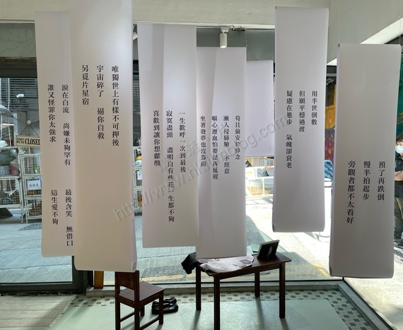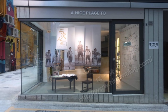 《二次人生》電影展覽安排於毗鄰港鐵西營盤站忠正街2-4號A Nice Place To舉行,在門口已經看到由不同的直幅組成《二次人生》的主題。