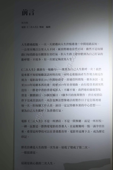 近年來,不同的香港電影在上映前都想不同的方法,希望可以吸引觀眾的注意,當中高先發行、何力恆執導,譚耀文、胡子彤、強尼、陳逸寧、吳海昕及蔡裕彤主演的《二次人生》在明天上映,而電影特別為此舉行為期三星期的展覽,展示電影製作點滴。