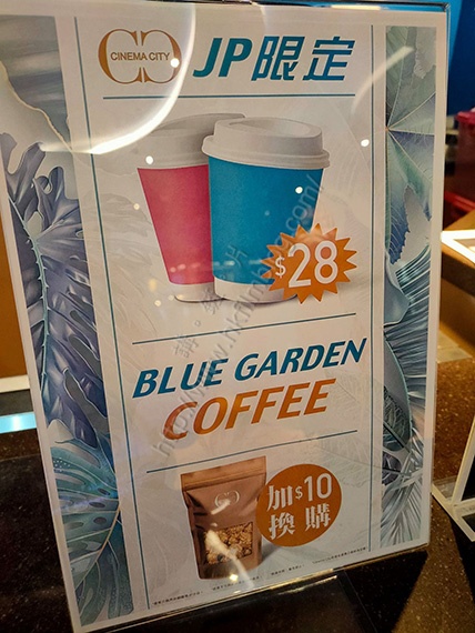 上圖所見,便是「講。鏟。片」情報人員於日前在銅鑼灣Cinema City JP戲院所攝,可以看到該戲院的小食部提供了最新的優惠,就是Blue Garden咖啡,每杯承惠二十八元,而且還可以加十元換購袋裝爆谷一包。
