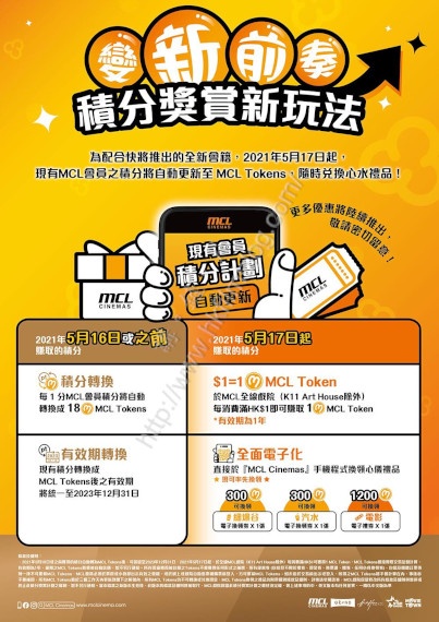 上圖所見,便是MCL院線對其會員的最新公佈,指為配合快將推出的全新會籍,將於下周一起改動其會員積分制度,現有的MCL會員積分將會自動轉換成新的MCL Tokens,兌換率為一分換成十八個Token,而有關Tokens在轉換後,將會於2023年12月31日到期。