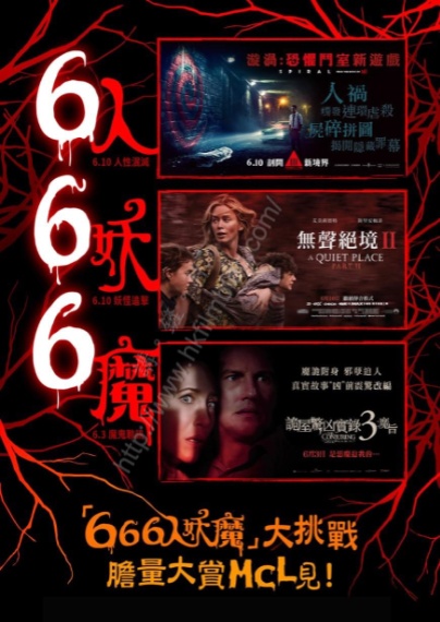 上圖所見,便是MCL院線推出的「666人妖魔」大挑戰,當中包括了六月十日上映的《漩渦:恐懼鬥室新遊戲》與《無聲絕境II》,以及六月三日上映的《詭屋驚凶實錄3:魔旨》。三部電影分別以「人性泯滅」、「妖怪追擊」及「魔鬼聆訊」作點題來配合「人妖魔》主題。