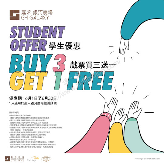 上圖所見,便是嘉禾銀河廣場新的票價優惠,學生於六月一日至三十日期間於嘉禾銀河廣場票房購票,便可以享有戲票買三送一的優惠。當然,有關安排亦會受到條款所限,例如個別電影因片主協議而未能提供優惠等。