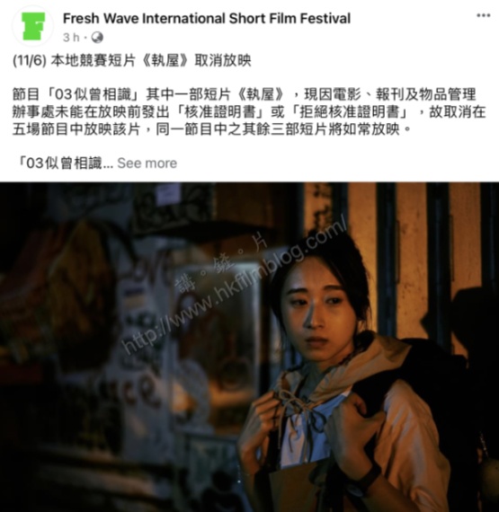 上圖所見,便是鮮浪潮在其官方Facebook專頁發出的通知,指《執屋》因未在放映前獲電影、報刊及物品管理辦事處發出「核准證明書」或「拒絕核准證明書」,故此需要取消放映,該節目的放映短片數目亦由四部減至三部。