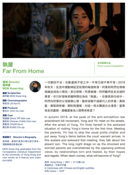 《執屋》是本屆鮮浪潮本地短片競賽的短片之一,由曹浩文監製、莫坤菱執導兼編劇、黎家浩攝影,演員陣容包括葉蘊儀、陳哲民、覃嘉淇及龔志業,電影以2019年反修例運動期間,其中一名男子被捕,而相識的女友為男友執屋的故事。