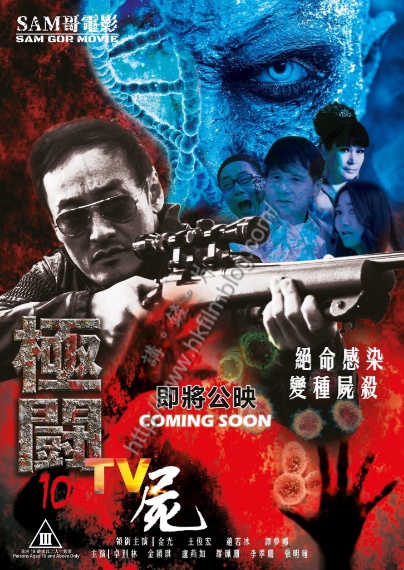 上圖所見,便是電影《極闘10之TV屍》電影海報,海報寫上「絕命感染,變種屍殺」為點題字眼,可以看到海報出現喪屍與病毒的模樣,還有Sam哥招牌式拿槍的表情。電影演員方面,領銜主演包括了金光、王俊宏、趙若冰與譚夢娜,而主演則包括卓別林、金穎琪、盧燕如、羅佩珊、李翠珊與張明翰。而左下角則有一個三級標誌,意味電影已被評為十八歲以下人士不准觀看的第三級別。