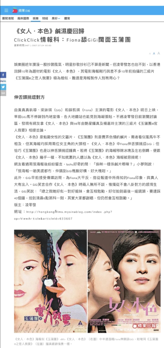 二零零七年六月十五日,「講。鏟。片」開始了運作才一個月零三日,那時還是在新浪網誌營運時,那天我寫了一篇名為「《女人.本色》之官人我要」的文章」,結果同年七月四日《蘋果日報》的一篇名為「《女人.本色》鹹濕慶回歸」,還拿了本網誌的文章出來「參考」,就連讀者留言也照抄可也。而網誌的原圖也用上,還打上了《蘋果日報》的水印。