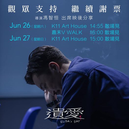 本周末及周日《遺愛》謝票場次共有三場,當中星期六設有兩場,分別為下午兩時五十五分K11 Art House場次,以及下午四時正嘉禾V Walk場次。至於星期日,則會安排在下午三時正K11 Art House場次作映後分享。
