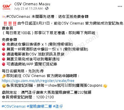 不過,今年在氹仔與路氹地區將會各有戲院落成,當中先開業的將會是位於氹仔市中心星皓廣場的CGV Cinemas。而上圖所見,便是CGV Cinemas澳門在官方網站的通告,指在八月底前在其官方網站成功登記為免費會員,每天首一百位可獲限定禮遇。