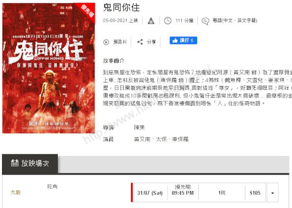 上圖所見,便是百老匯院線的網站預售截圖,可以看到《鬼同你住》將安排於本周末七月三十一日晚上九時四十五分在旺角百老匯一院放映優先場,而戲票亦已經公開發售。