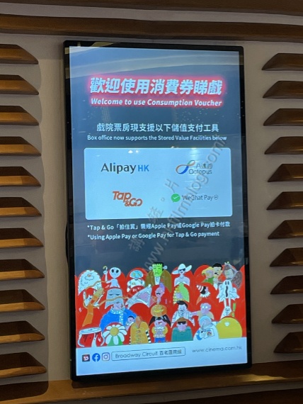 上圖所見,便是「講。鏟。片」情報人員於昨天在鑽石山荷里活廣場荷里活百老匯戲院票房所見,可以看到在票房位置特別展示了一張電子海報,寫上「歡迎使用消費券睇戲」,指出戲院票房支持四款儲值支付工具平台,包括支付寶香港、八達通、Tap & Go及微信支付香港。