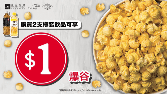 上圖所見,便是嘉禾院線最新提供的優惠,觀眾只需要在嘉禾旗下任何一家戲院購買指定樽裝飲品兩支,便可以用一元來換購爆谷一包。而有關優惠亦不只限於嘉禾大埔,在嘉禾全數十家戲院亦同樣適用,當然優惠只是期間限定。
