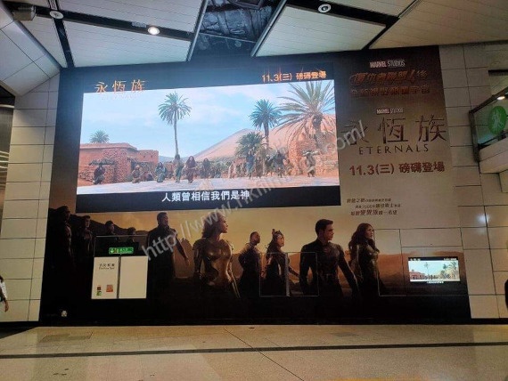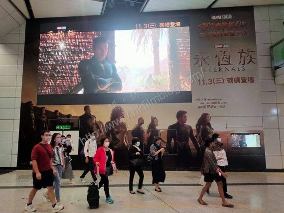 上圖所見,便是「講。鏟。片」情報人員日前於港鐵香港站與中環站的大堂連接通所攝,可以看到迪士尼發行、擬於十一月三日上映的Marvel電影《永恆族》的宣傳,當中宣傳面積有兩層樓高,配合投影機滾筒式播放電影《永恆族》的預告,而下方則看到一眾主角向著右方,可以說是相當落本地宣傳。