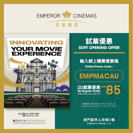 上圖所見,便是來自英皇戲院官方網站的截圖,可以看到該戲院於首月試業提供票價優惠,使用優惠碼於網上購票,成人2D票價將由澳門幣115元減至85元。