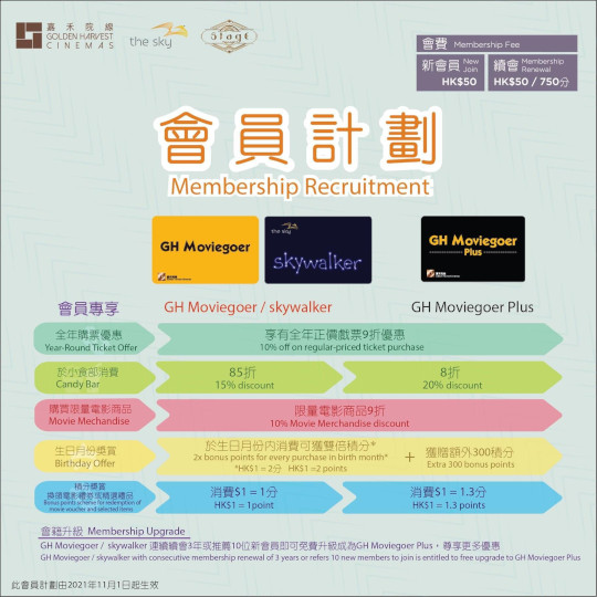 上圖所見,便是嘉禾院線於十一月一日起推出的全新會籍,當中新會員會費為五十元,而續則合以五十元或七百五十積分。當中會籍過去的優惠依舊,不過最為重要的改變,就會員可以有全年正價戲票九折優惠。