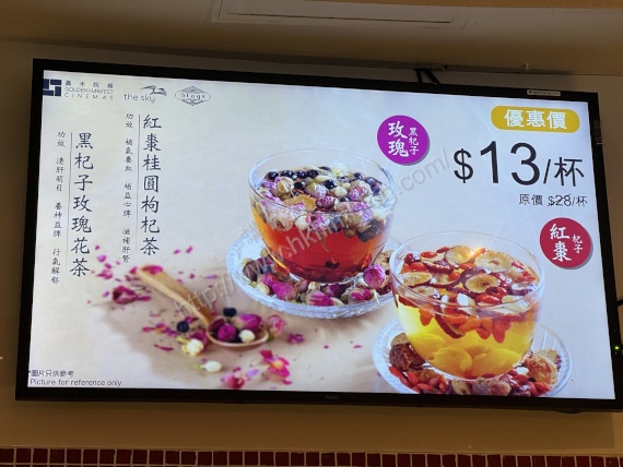 上圖所見,便是「講。鏟。片」情報人員在奧海城二期的The Sky戲院小食部所攝,可以看到該戲院小食部的屏幕顯示了兩款熱飲,包括了紅棗桂圓枸杞茶,以及黑杞子玫瑰花茶,而且還列出其功效所在,如前者可以補氣養血、補益心脾及滋補肝腎,後者則可以清肝明目、養神益脾及行氣解郁。似乎是次的飲品,是衝著天氣轉涼而設。