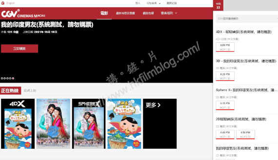 上圖所見,便是今天來自CGV澳門官方網站的截圖,可以看到CGV澳門網站正在測試售票系統,更特別提醒觀眾切勿票。當中包括4D版《屁屁偵探》、3D版《我的印度男友》及SphereX版《我的印度男友》等,看起來也相當奇趣。