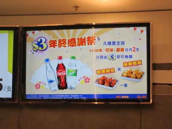 上圖所見,便是「講。鏟。片」情報人員在其中一家MCL院線旗下戲院所攝,可看到該戲院正在推出「$3年終感謝祭」,觀眾凡購買5100水、可樂或雪碧任何兩支支裝飲品,便可以用三元來換購咖喱魚蛋或魚蓉燒賣一客。