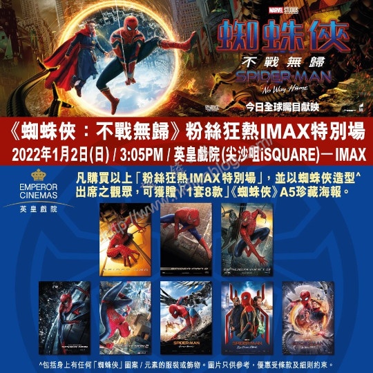 而索尼發行似乎為了電影破億元大關都十分熱烈,將安排於本周日下午三時零五分假尖沙咀iSquare英皇戲院舉行粉絲狂熱IMAX特別場,觀眾更有機會獲贈一套八款《蜘蛛俠》A5珍藏海報,有意參與的觀眾看來要從速購票好了。