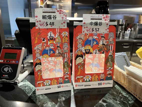 上圖所見,便是「講。鏟。片」情報人員在戲院停業前於九龍站圓方商場Premiere Elements的小食部所攝,可以看到該戲院的爆谷包裝已經換成了百老匯院線品牌的包裝設計,換上漫畫款式的設計,並且設有透明窗口看到包裝內的爆谷。