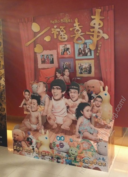 一四年農曆新年,黃百鳴監製、谷德昭執導的賀歲電影《六福喜事》在香港上映,而上圖所見就是電影在戲院擺放的大型宣傳紙板。當中在宣傳上最為驚為天人之處,就是抱片中的一眾主角的頭,以移花接木的方式,移到一眾嬰兒身上,以配合電影關於BB的主題。然後前方又配上一堆玩具,好讓這些「嬰兒」可以享用一下。