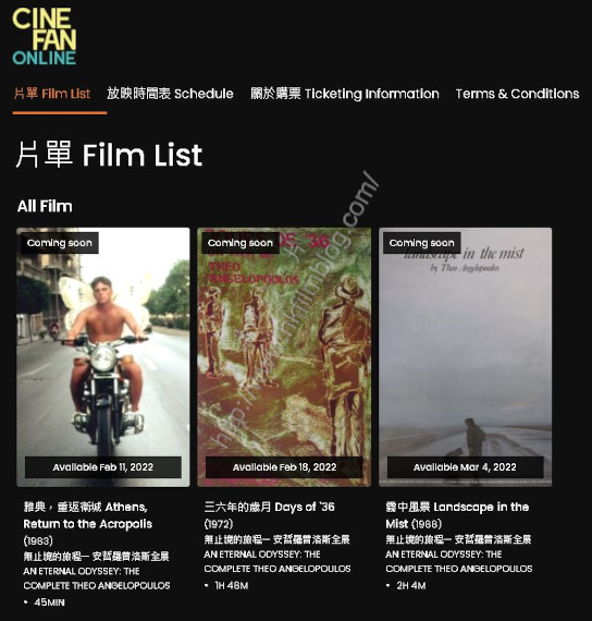 上圖所見,便是電影節發燒友網上放映的片目,在香港的戲院因為新型冠狀病毒,自一月七日起被政府勒令停業,雖然目前停業至二月三日,但觀乎疫情似乎二月四日戲院重開的機會不大。當中香港國際電影節協會的電影節發燒友放映節目亦受到影響。故此有關方面安排了「無止境的旅程— 安哲羅普洛斯全展」的三部電影《雅典,重返衛城》、《三六年的歲月》及《霧中風景》於二月至三月期間作網上放映。