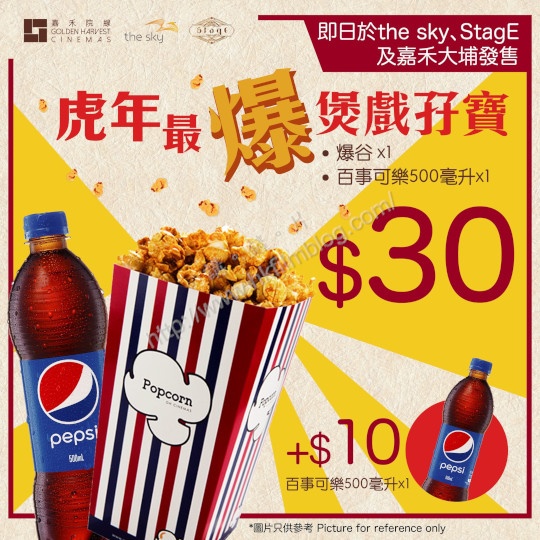 上圖所見,便是嘉禾院線推出的最新優惠,以「虎年最爆煲戲孖寶」為名,套餐包括爆谷一客及五百毫升百事可樂一支,套餐價承惠三十元,而多購一支百事可樂也只需要多付十元。