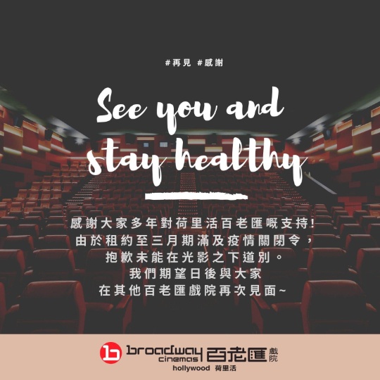 上圖所見,便是百老匯院線張貼的通告,指出位於鑽石山荷里活廣場的荷里活百老匯戲院由於租約至三月期滿,再加上戲院被政府勒令停業;,故此只能在網上與觀眾道別。