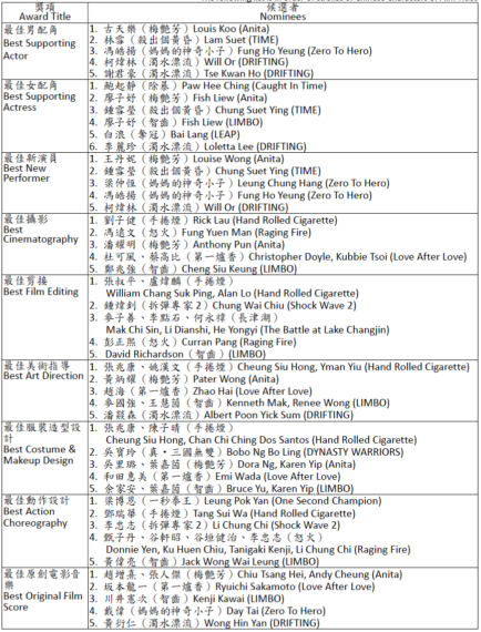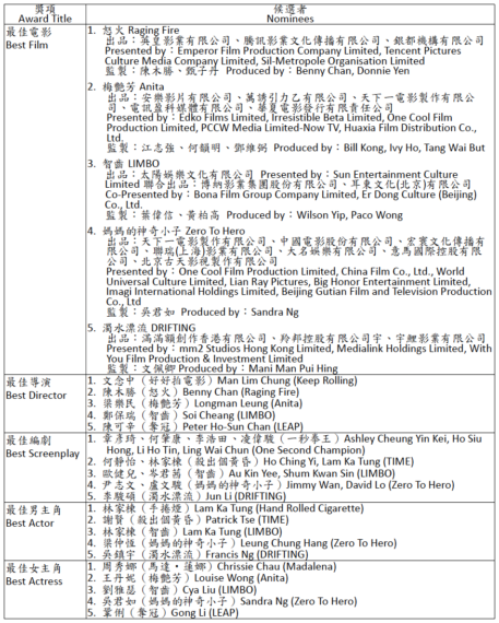 第四十屆香港電影金像獎提名公佈 By Ryan On 16/02/2022 In 講鏟影展 第四十屆香港電影金像獎剛於今天下午官方發佈了新聞稿,並同時公佈了十九個獎項的入圍名單。 金像獎的提名名單,是由合資格的金像獎選民投票及一百名專業評審各佔一半得出的俗稱的「第一輪評選」。 各獎項的候選名單現詳列如下: 頒獎典禮預計於今年四月舉行,到底今次金像獎的提名名單有何啟示?大家可先行討論,稍後再作分析。 Ryan Previous 「壽命」極短的圍板宣傳 Next 港片一定要在戲院上映的麼? 發佈留言 取消回覆發佈留言必須填寫的電子郵件地址不會公開。 必填欄位標示為 *留言 * 顯示名稱 * 電子郵件地址 * 個人網站網址 Δ