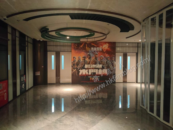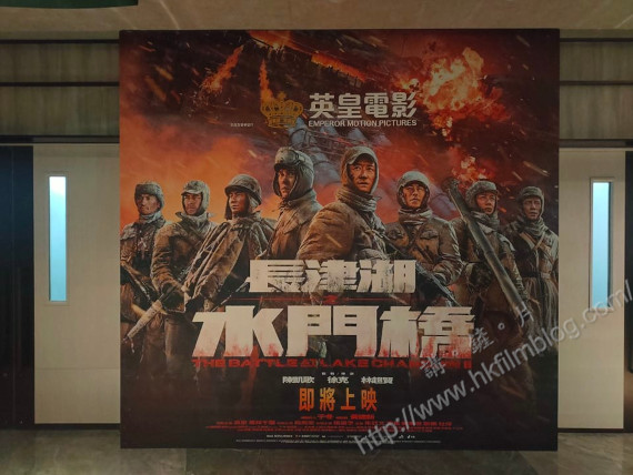 宣傳板的廣告,就是英皇發行,陳凱歌、徐克及林超賢合導的《長津湖之水門橋》,可以看到背景繼續是火光熊熊,而一眾演員們則「一字排開」拿著槍砲。然而,宣傳並沒有定上確實映期,只寫上「即將上映」四字。看來即使有觀眾期待此片也好,也恐怕需要一段時間後,才有望在香港看到吧!