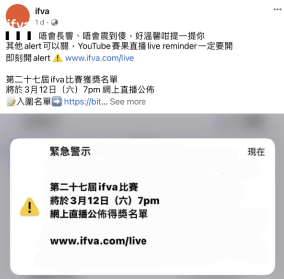 上圖所見,便是ifva在其官方Facebook專頁所貼出的發文,當中圖片採用仿如緊急警示的方式,提醒大家第二十七屆ifva比賽將於明天晚上七時正,將於網上直播公佈得獎名單,並且提供了相關的連結。