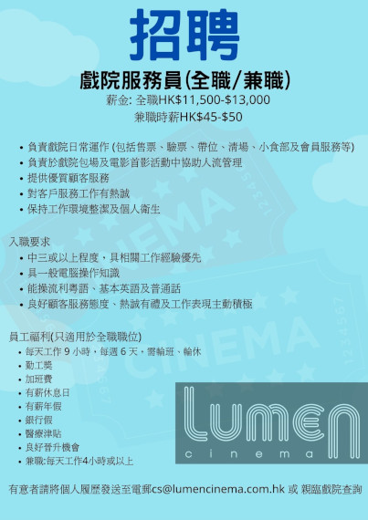 上圖所見,便是位於葵涌打磚坪街的Lumen Cinema於其官方Facebook專頁張貼的通告,該戲院正在招職全職與兼職的戲院服務員,當中全職薪金為11,500元至13,000元,兼職時薪則為45元至50元。全職員工每天工作九小時,每週工作六天,並需輪班輪休,而兼職每天工作最少四小時。