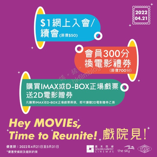 上圖所見,便是嘉禾院線今天剛於Facebook發出的推廣優惠,該戲院將會於四月廿一日戲院重開至五月三十一日期間推出三項優惠。當中首項就是將網上入會與續會費用由五十元減至一元,而會員換領電影禮券由七百分減至三百分。另一方面,凡購買IMAX或D-BOX正場戲票兩張,便可獲贈2D電影禮兩張。