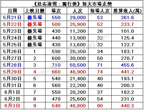 《壯志凌雲:獨行俠》雖然要到五月廿六日才正式上映,不過在上映前周末起,已經推出猶如全日上映的優先場,周末上映場次逾五百場,而平日亦在四百場以上。可是電影屬於三十六年後的續集,故此初期似乎入場的以年紀較成熟的觀眾,假日平均人次在52至53左右,平日人次則在26至32左右,看起來並不突出。
