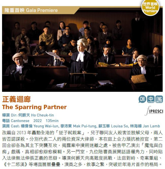 新導演方面,便何初次執導長片何爵天的《正義迴廊》,電影以2013年的逆子弒殺案為藍本改編,電影演員陣容包括楊偉倫、麥沛東、蘇玉華與林海峰,且看電影在法庭電影類型上如何突破。電影將於本屆香港國際電影節作世界首映。