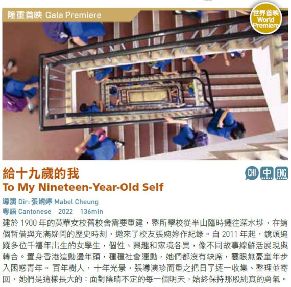 同樣作世界首映的,還有張婉婷執導的新作《給十九歲的我》,電影屬紀錄片類型,紀錄了英皇女校的情況。